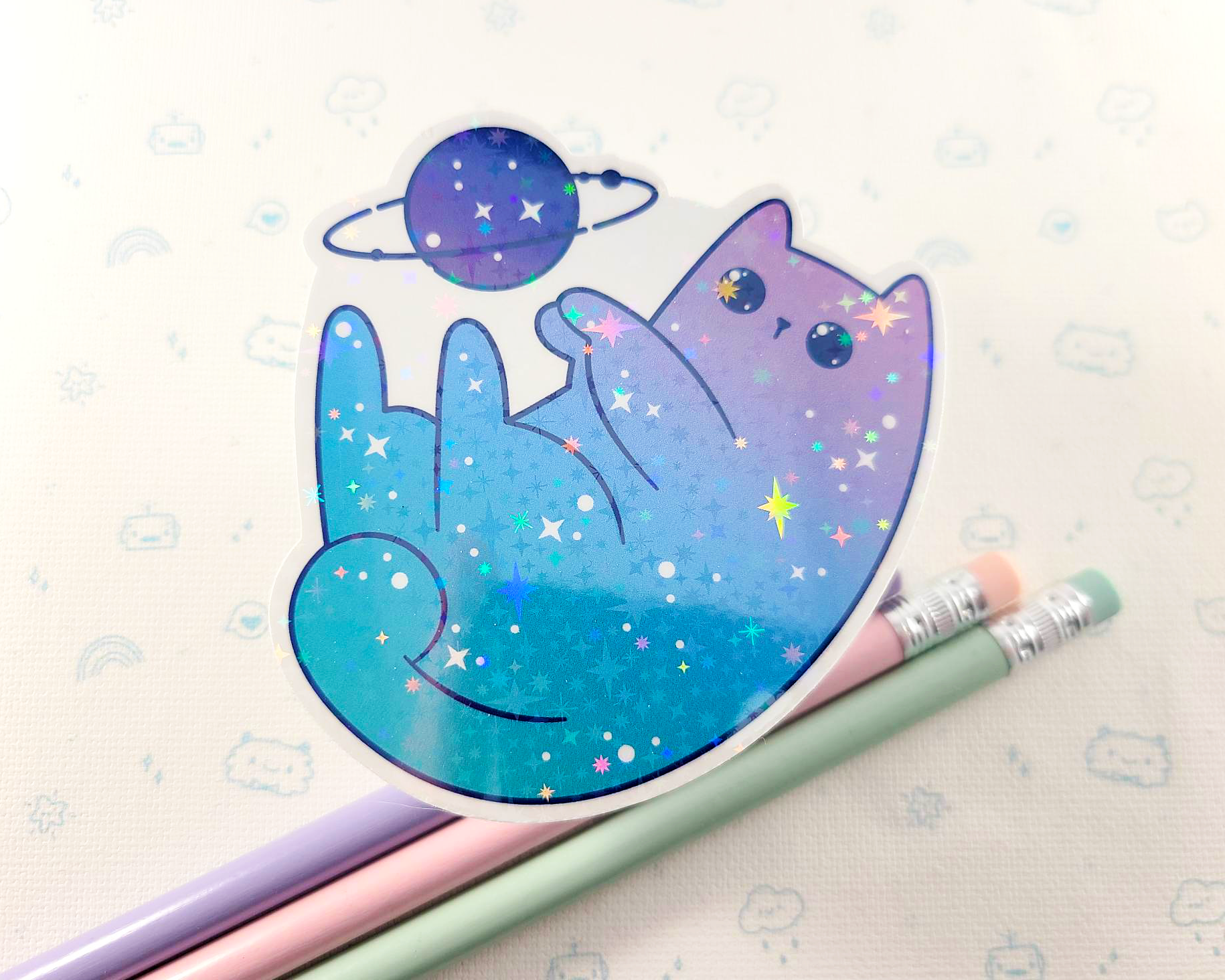 Cat Space with Planet Holographic Stars Sticker